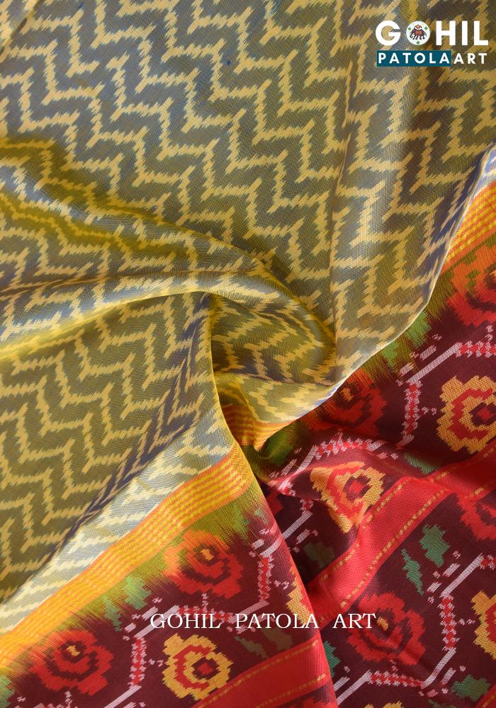 Bluish yellow zigzag design red brawn border pallu saree